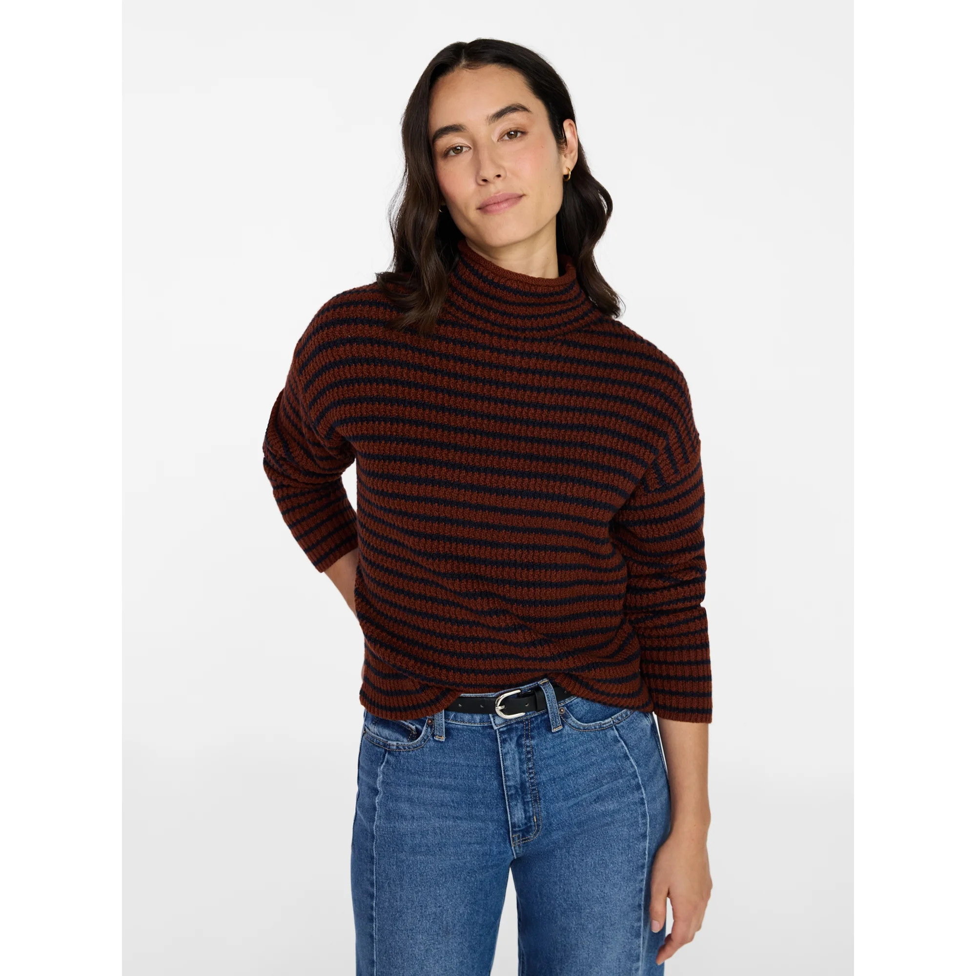 Time and Tru Women's Stripe Funnel Neck Sweater with Long Sleeves, Midweight, Sizes, XS-XXXL