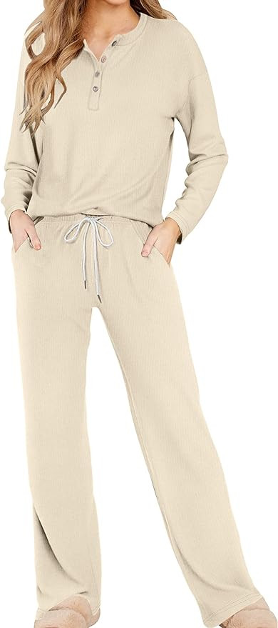OFEEFAN Woman's Lounge Sets Button Up Pajama Set Winter Long Sleeve 2 Piece Outfits With Pockets