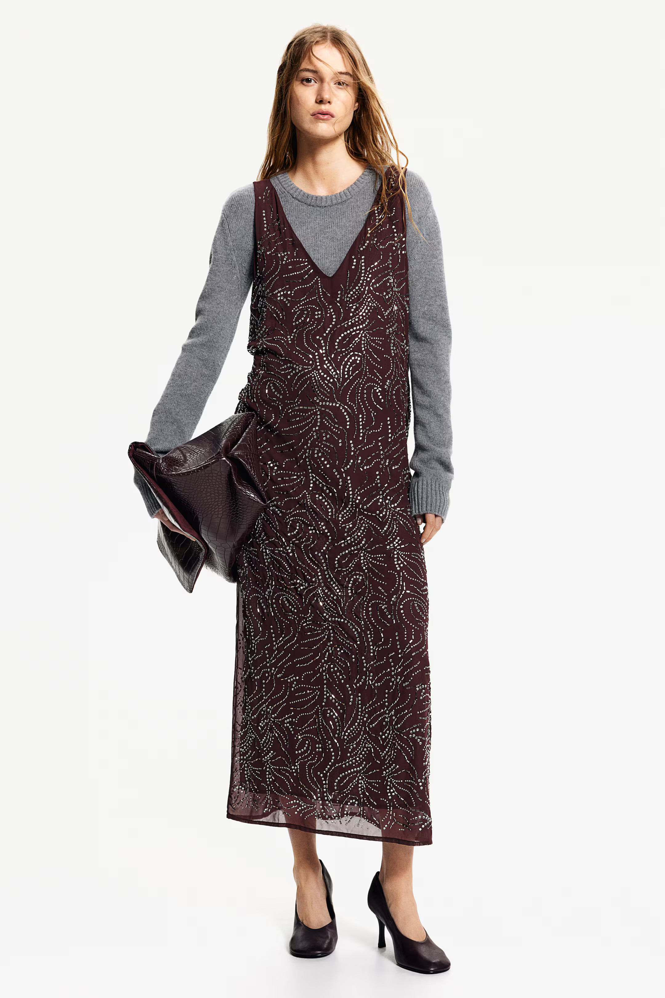Rhinestone-embellished Dress - Plunge Neckline - Sleeveless - Burgundy - Ladies | H&M US