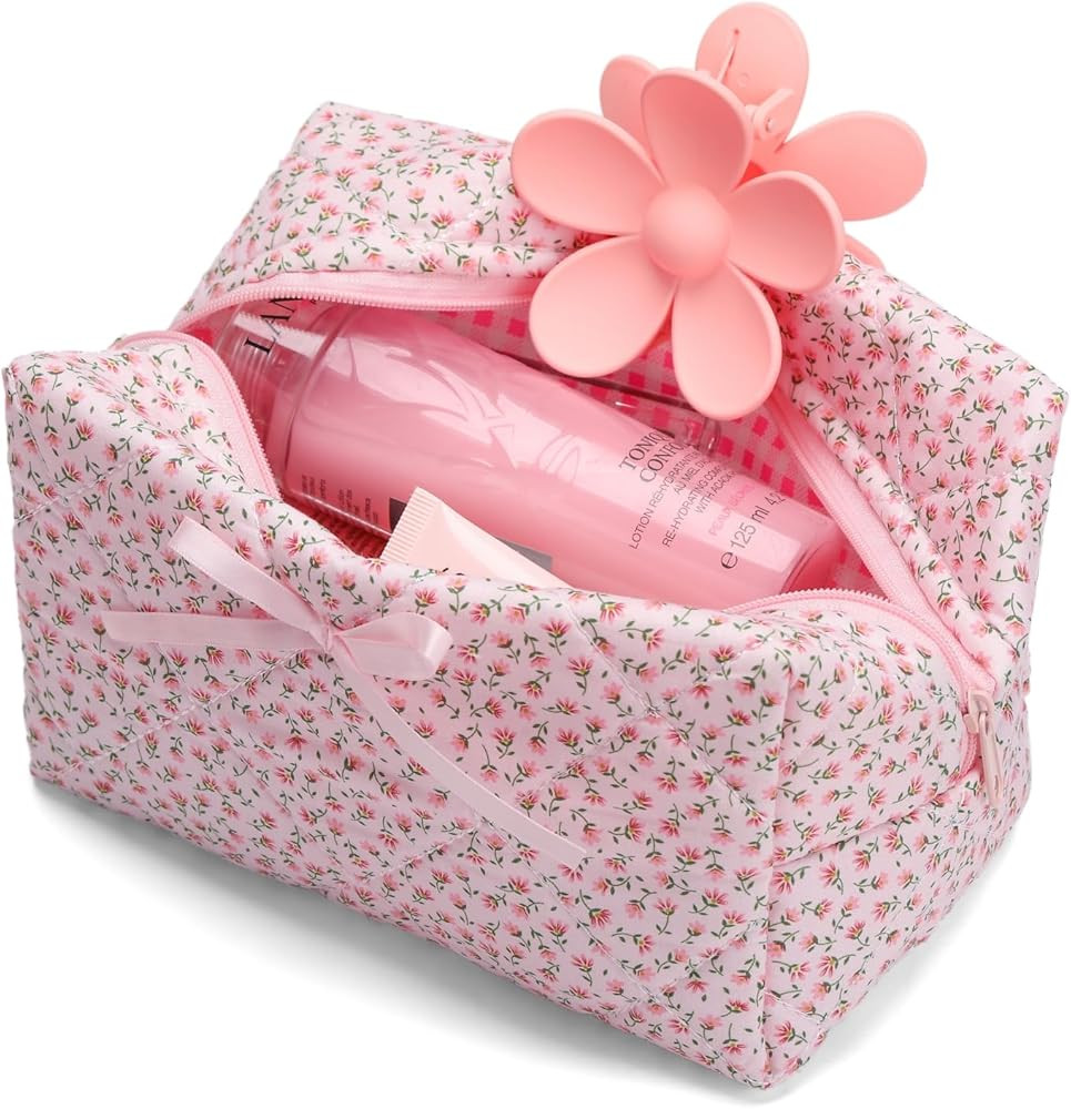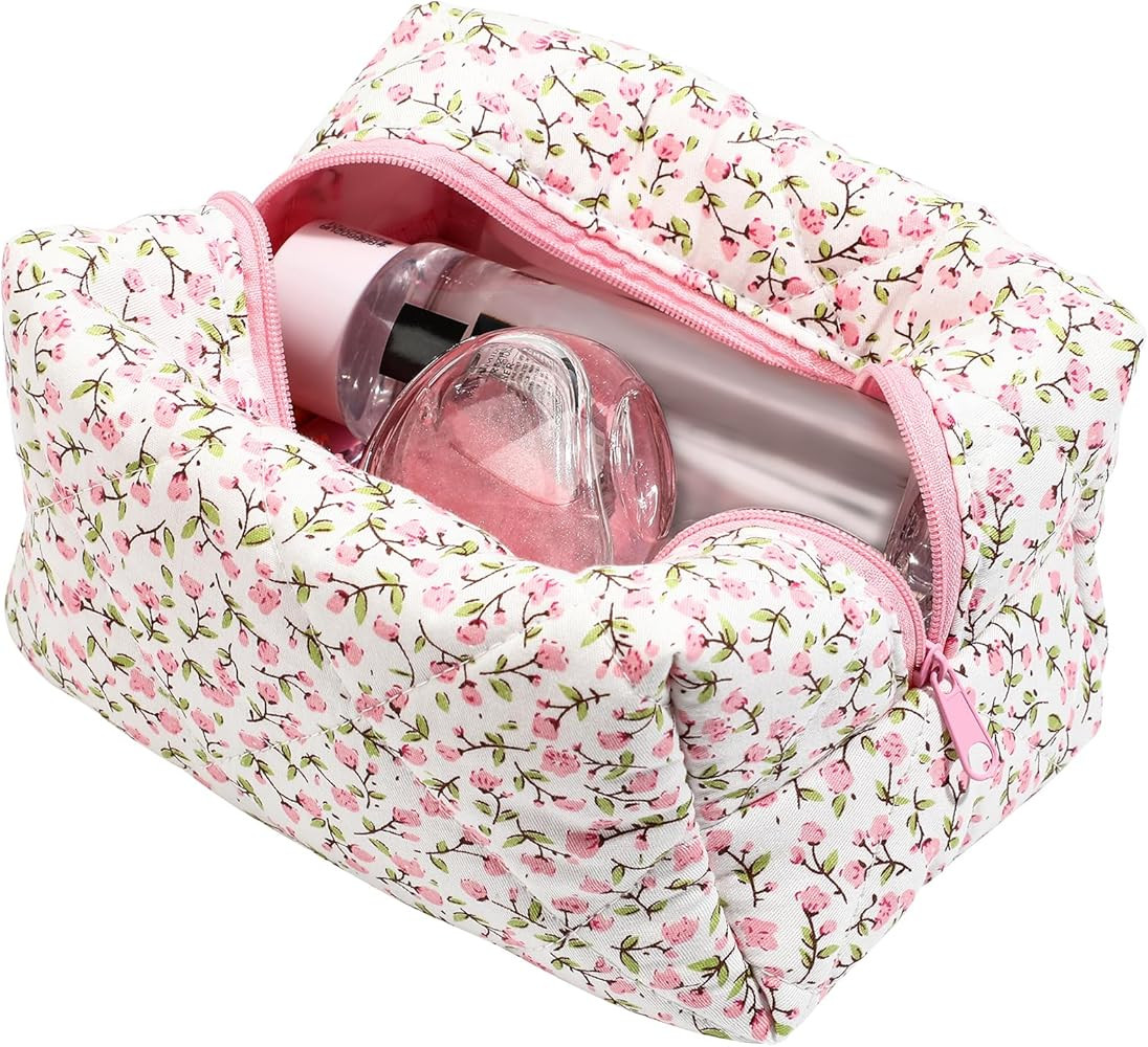 Quilted Makeup Bag, Floral Cosmetic Bag Cute Handmade Aesthetic Pink Toiletry Bag Flower Coquette...