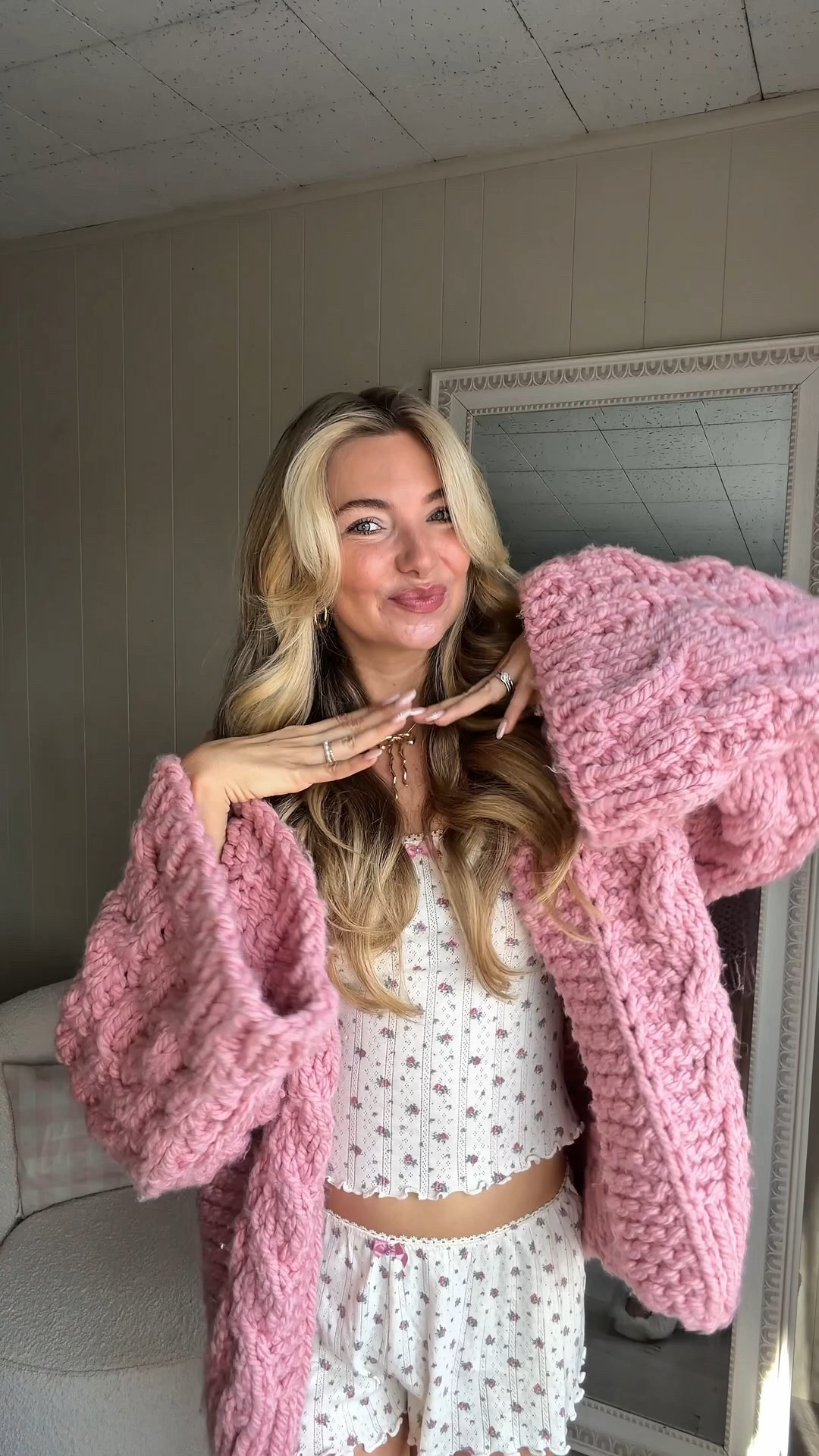 The perfect spring outfit: a chunky pink cardigan, dress & boots