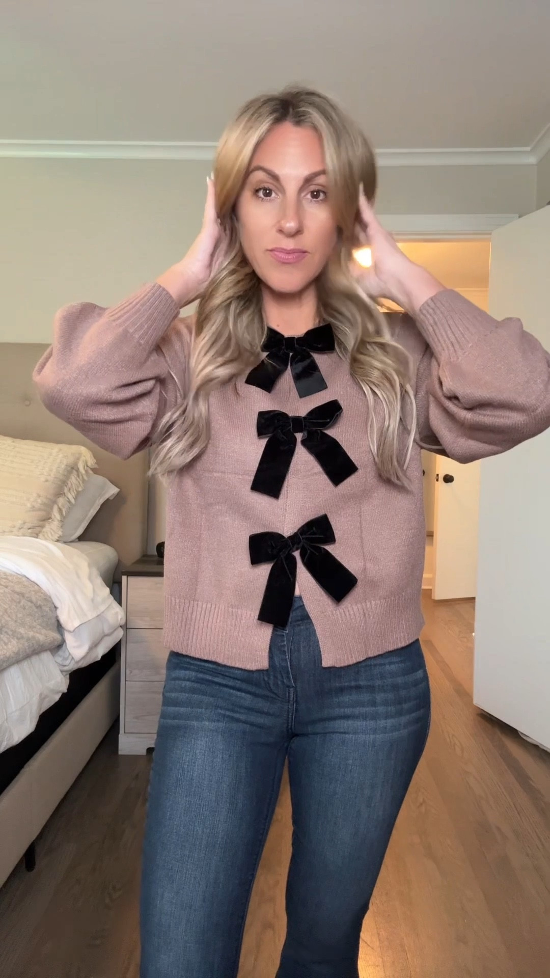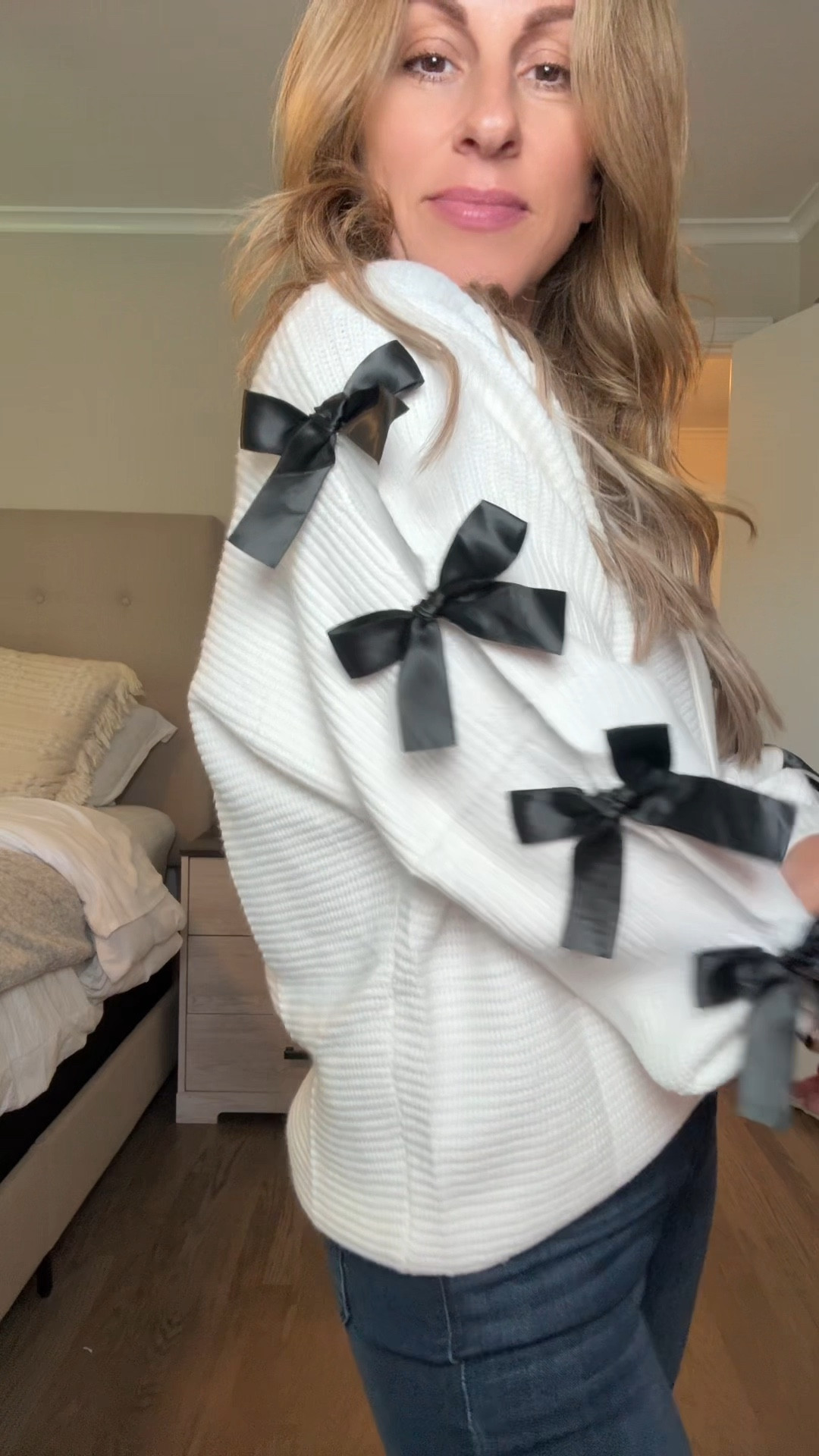 Bow sweater flat jeans boot cut brown boots booties Amazon