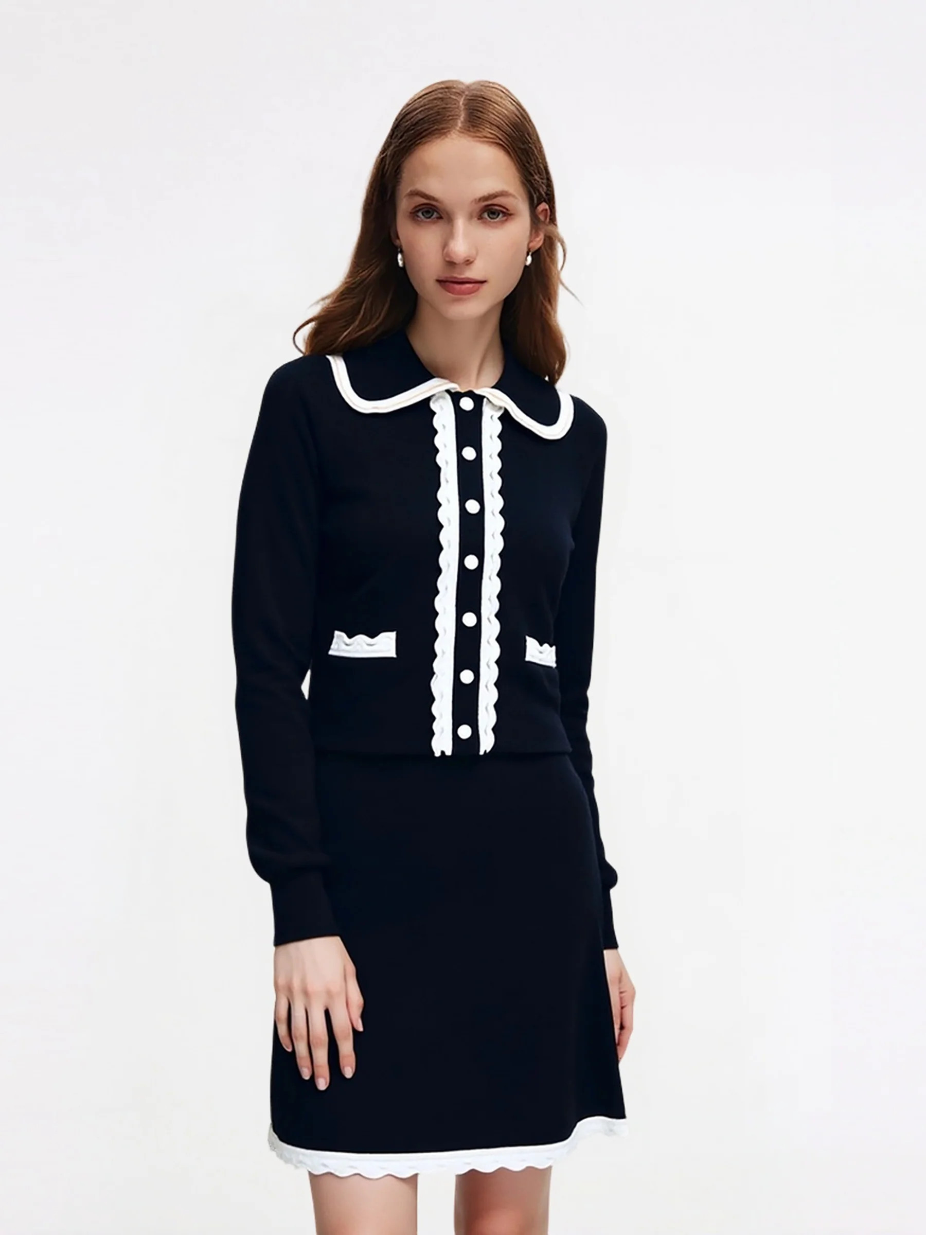Tencel Wool Blend Contrast Trim Cardigan And Knit Skirt Two-Piece Set
