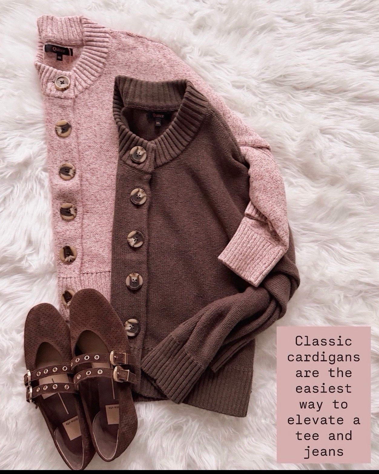 These soft pink layers with rich brown pants are one of my favorite wear now and later combos because it feels cozy but still polished. It’s the kind of outfit I can throw on for busy days and still feel put together.