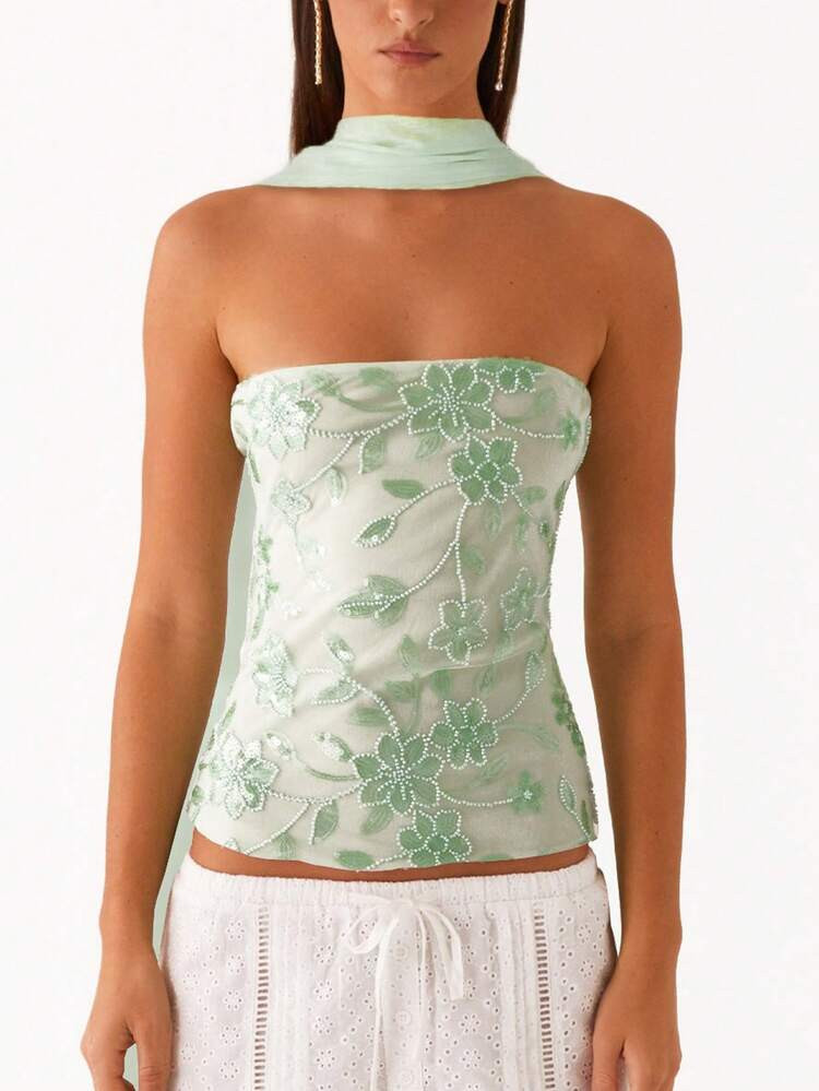 Women Summer Strapless Floral Sequins Beaded Tube Top With Scarf Party Club Tops