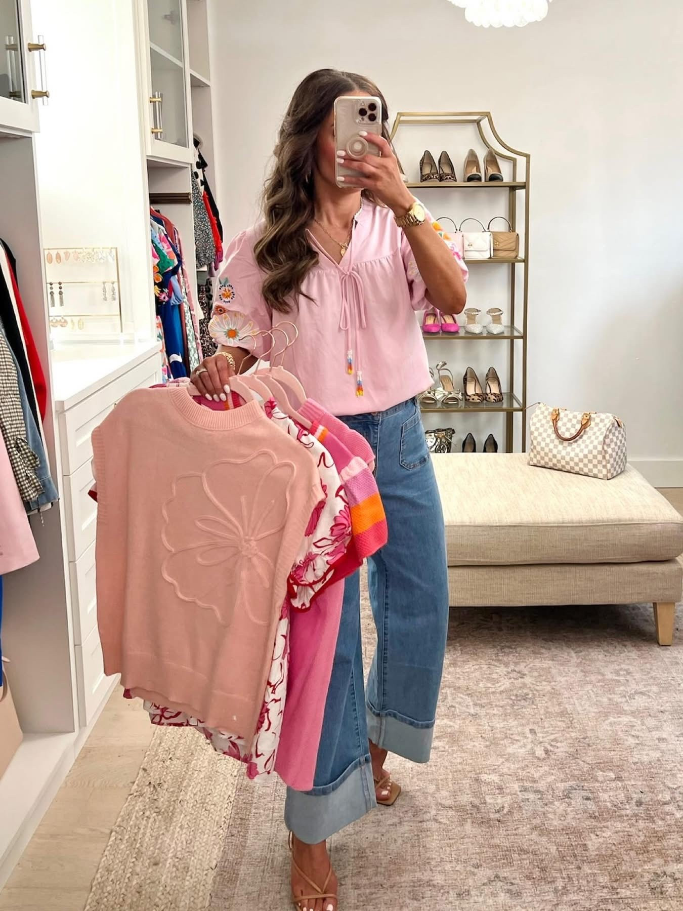 Hi! Loving this new top! Wearing size S. And size 4 in the jeans. Tons of colors too! 5’5 for reference