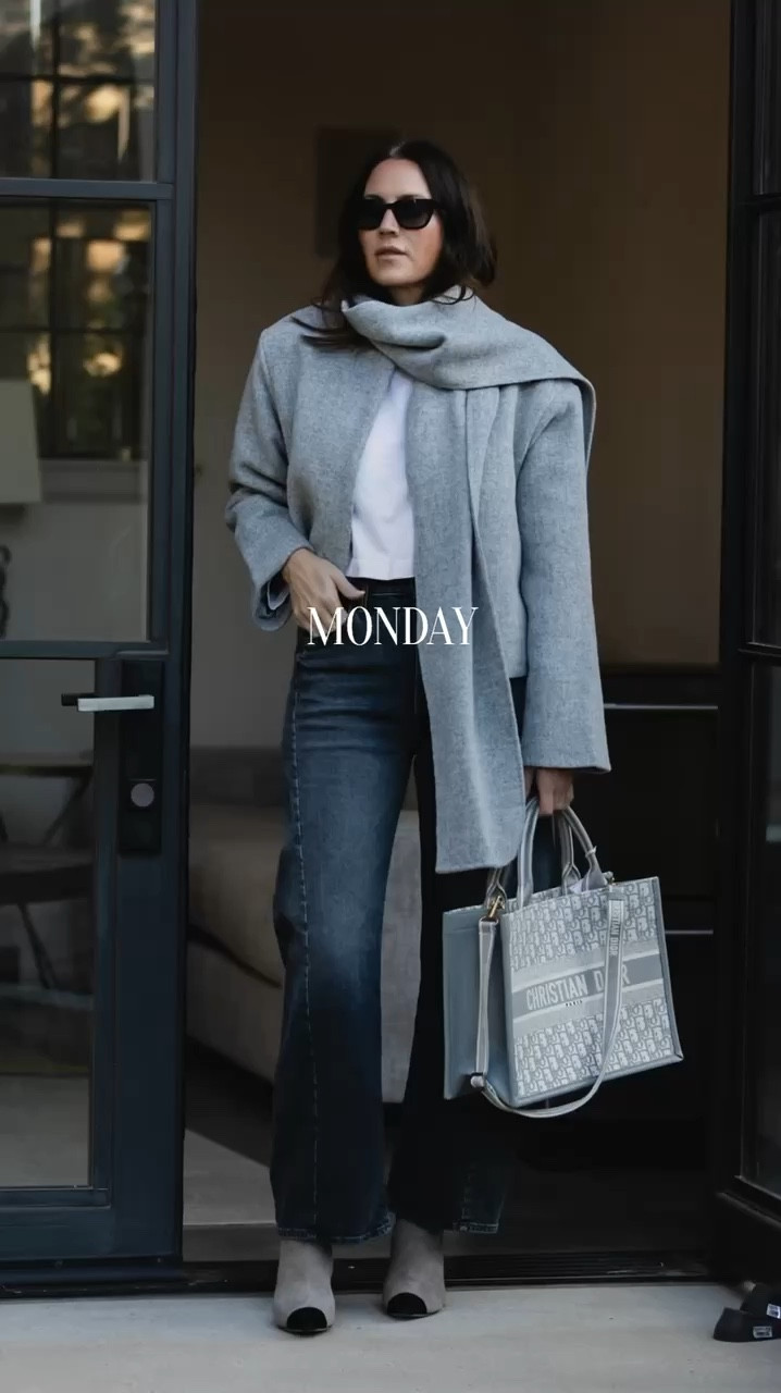 Monday: Classic neutral layers for workdays and meetings — tailored coat, sleek black base, and a structured tote.