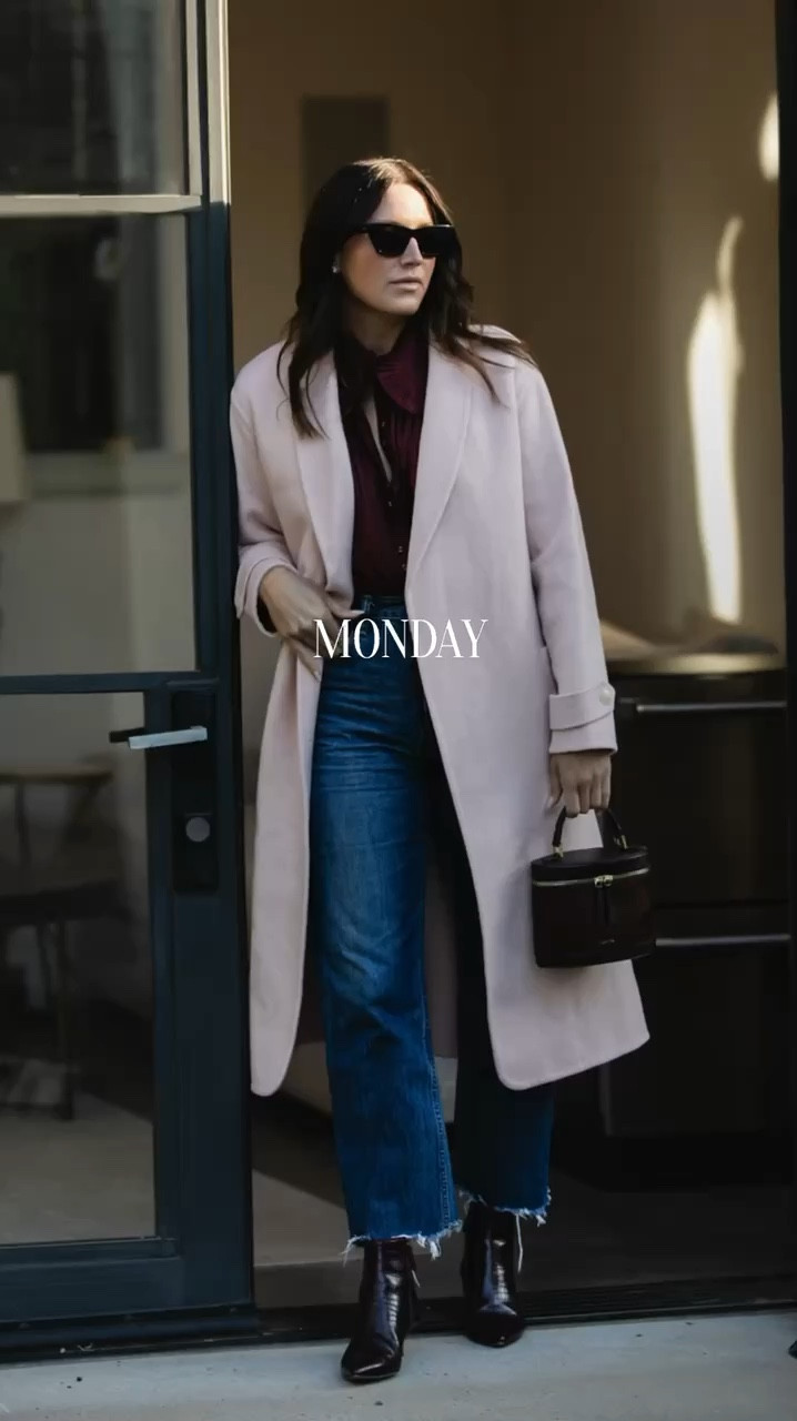 Monday: Classic neutral layers for workdays and meetings — tailored coat, sleek black base, and a structured tote.