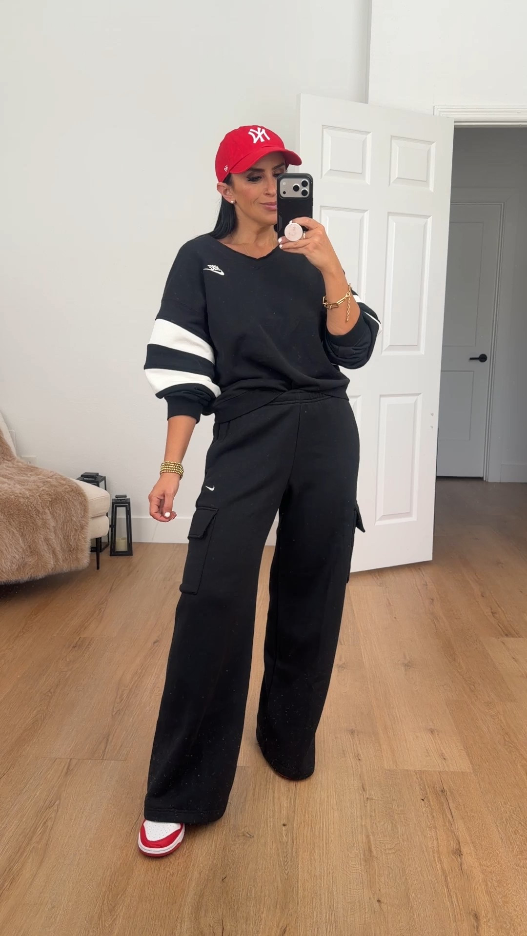 Nike One Women's Therma-FIT Oversized 1/2-Zip Fleece Top wearing size small. Nike Sportswear Phoenix Fleece Women's High-Waisted Wide-Leg Pants wearing size medium.