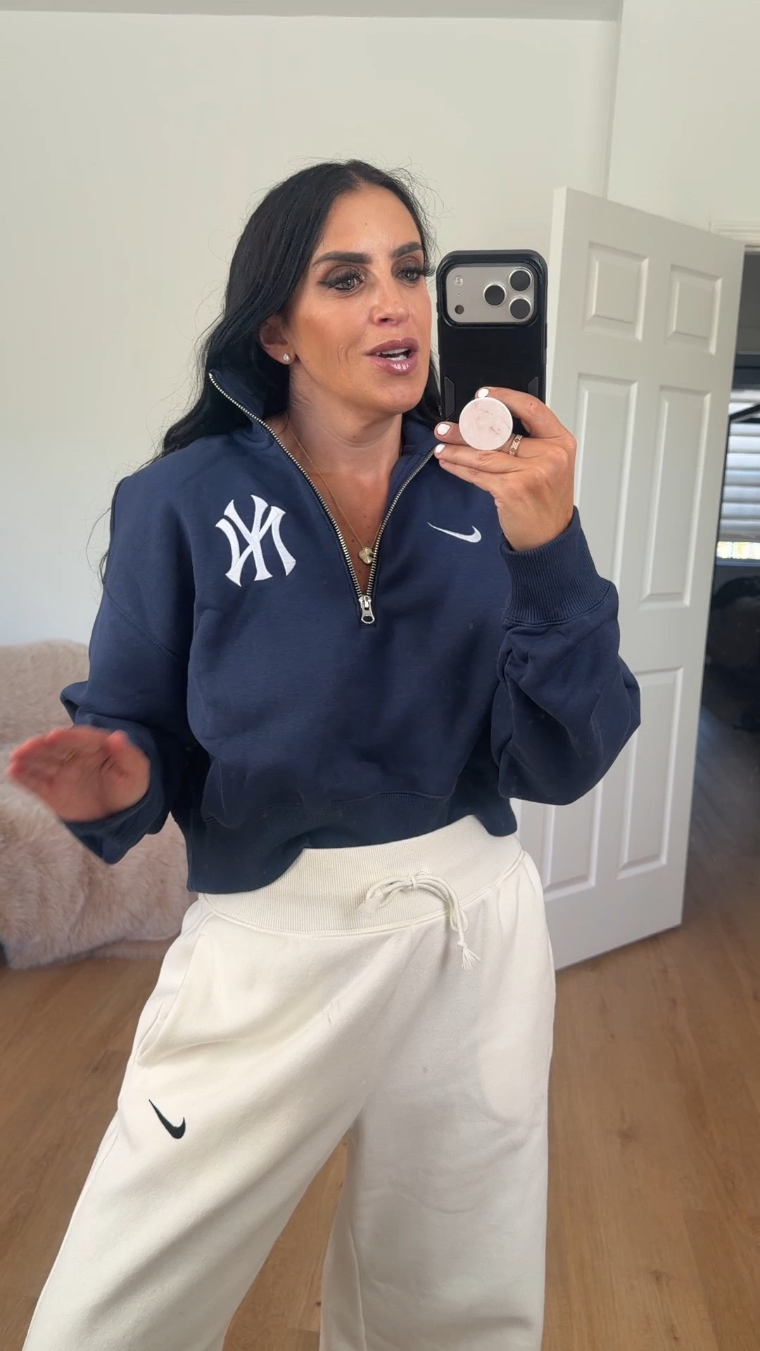New York Yankees Phoenix Women's Nike MLB Cropped 1/4-Zip Crew wearing size medium.