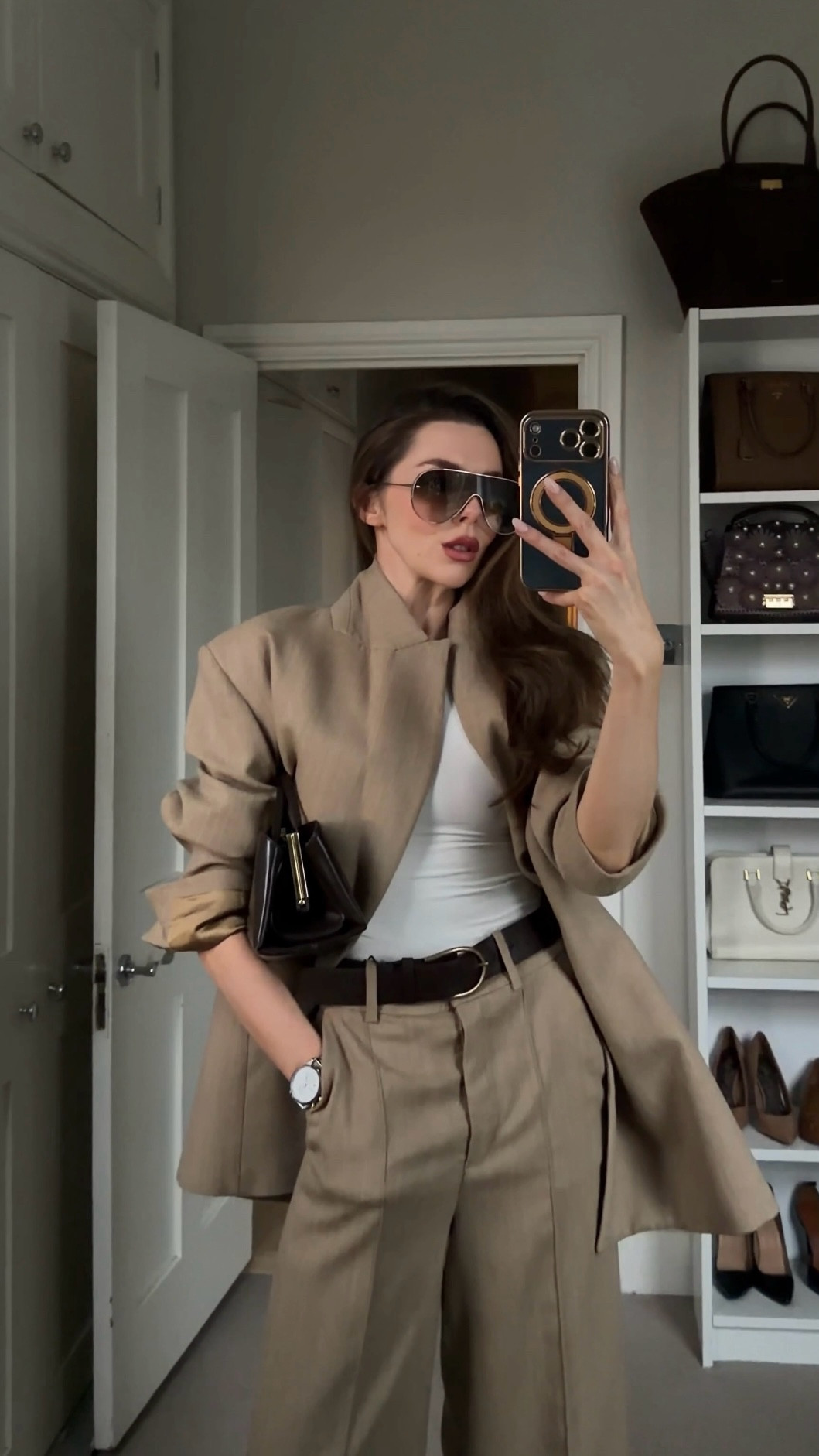 White tapered trousers paired with a taupe roll neck, brown long wool coat, brown knee-high stiletto boots, a wide brown belt, brown suede gold-handled clutch, and oversized sunglasses.