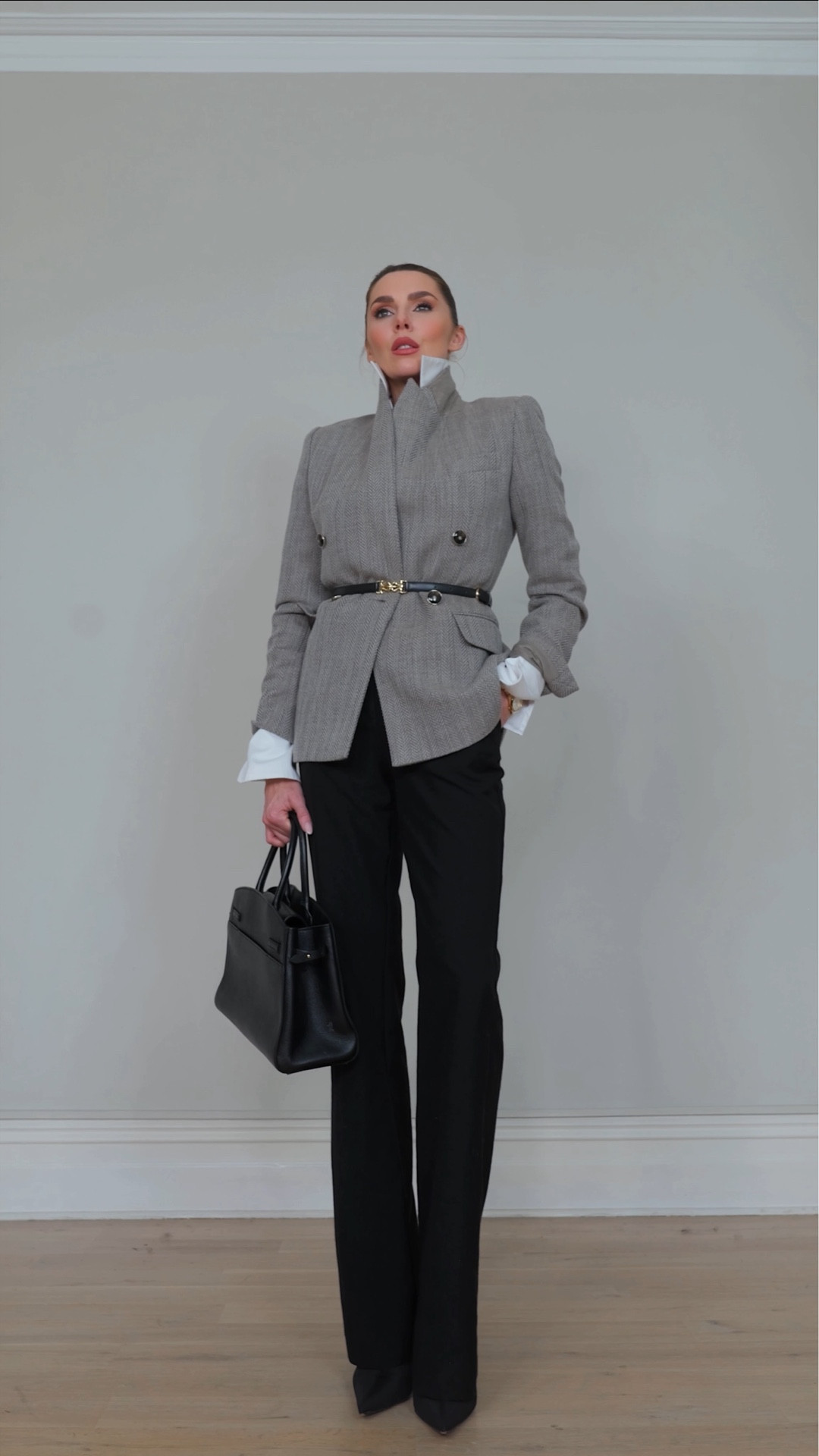 A black roll neck with black straight-leg jeans, black ankle boots, a thin black belt, black fur scarf, black Toteme lock bag, oversized sunglasses, and an oversized belted blazer.