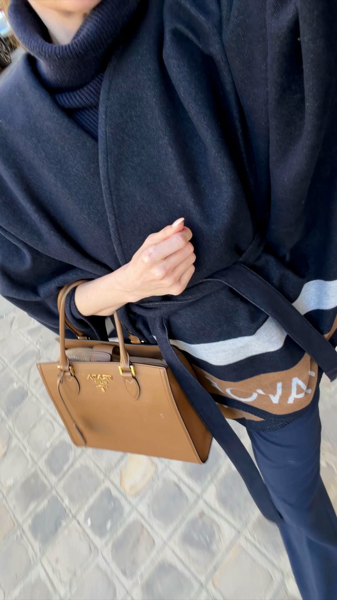 Black cashmere roll neck with subtle gold button detailing at the sleeve. A beautifully tailored black wool coat from Zara, cinched at the waist. Sharp black tailored trousers, classic black ankle boots, and oversized Yves Saint Laurent sunglasses. Finished with the large Demellier London tote that fits your laptop and your whole life.