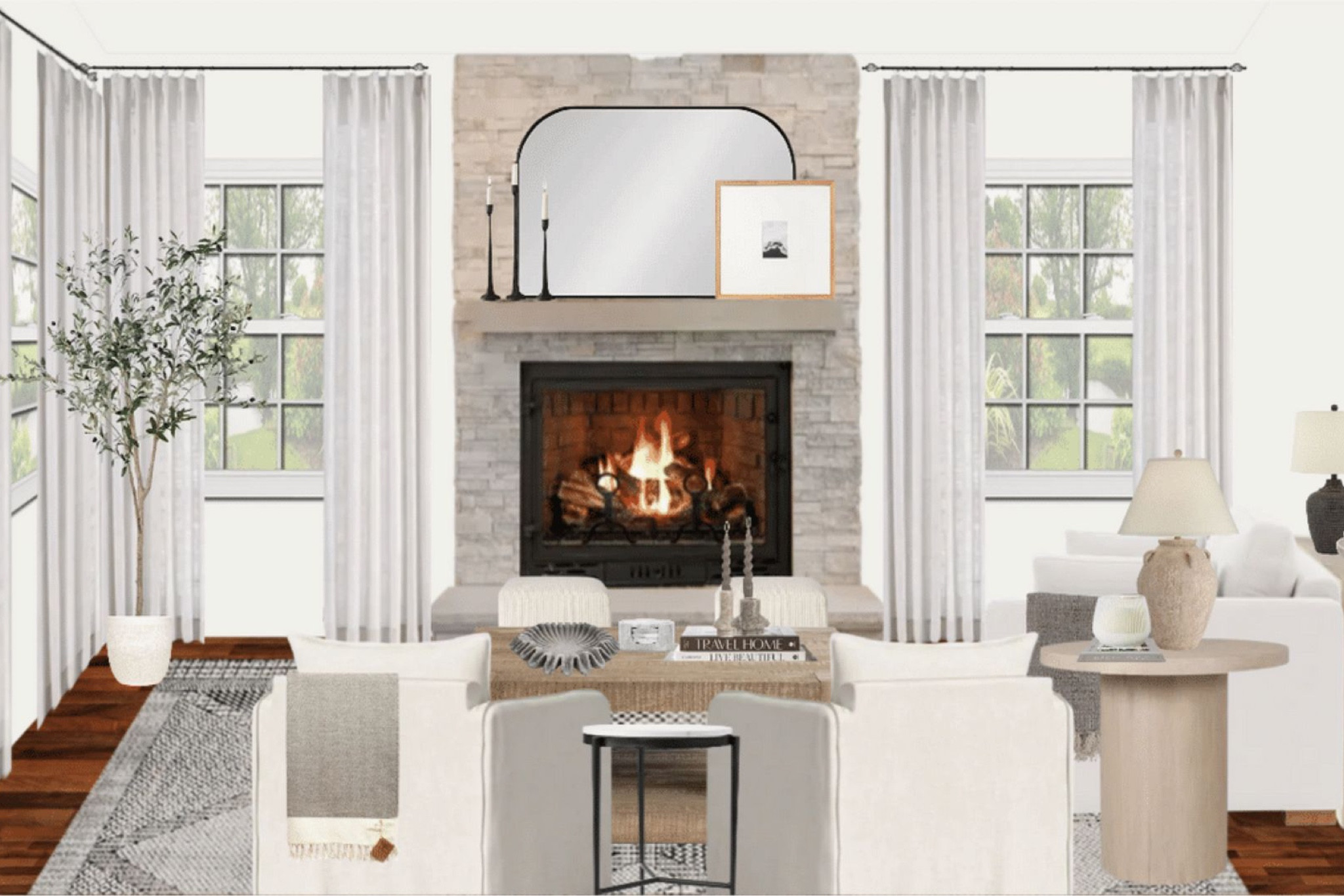 Wood coffee table, oversized coffee table, accent chairs, neutral decor, neutral family room, two-story family room, coffee table styling, coffee table books, tricorn black fireplace, upholstered ottoman, Target accent chairs, Wayfair coffee tables, Target home LTKhome