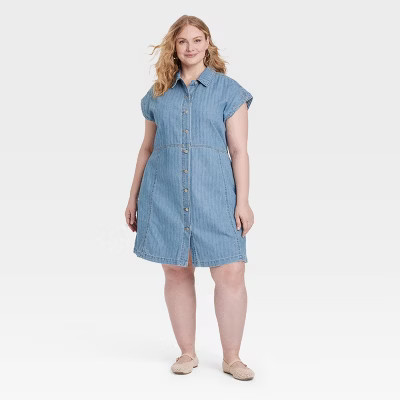 Women's Denim Flouncy Dress - Universal Thread™ Medium Wash XXL: Cotton Blend, Front Button Down, Cap Sleeve, Knee Length