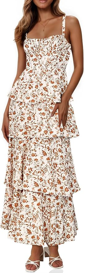Fisoew Womens Floral Maxi Dresses Spaghetti Strap Casual Sleeveless Ruffle Flowy Tiered Dress