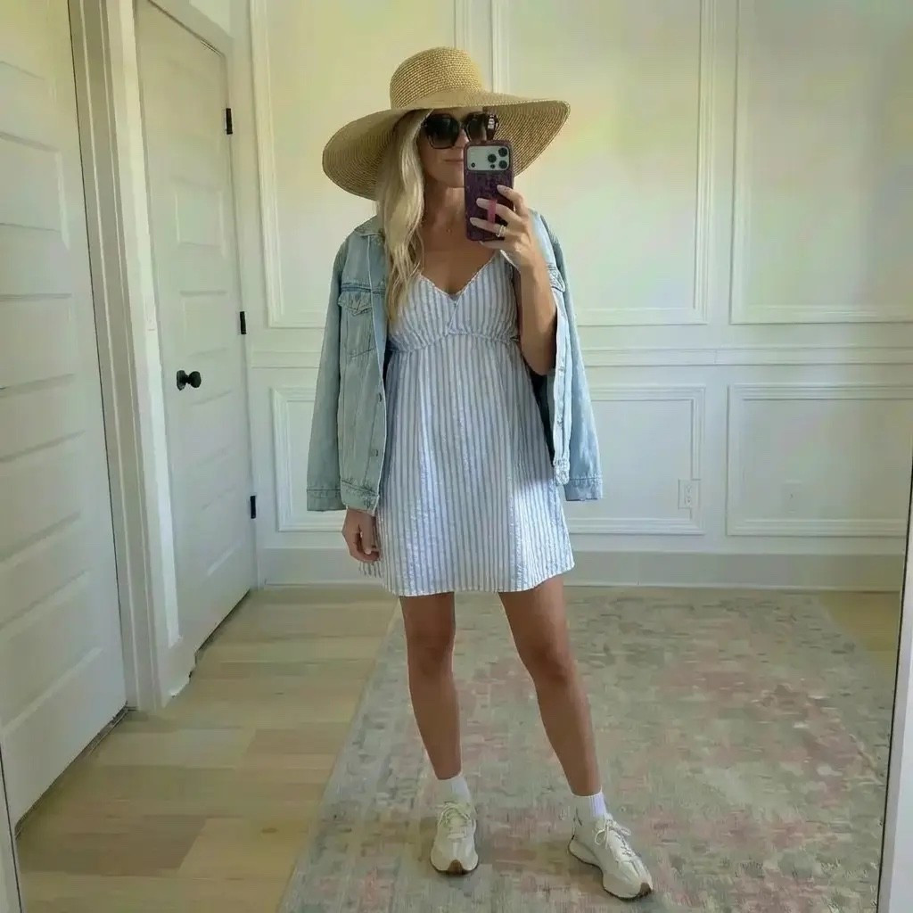 Golden daylight fills a quiet room as she pauses for a mirror moment, wrapped in soft blush tones that feel warm, feminine, and effortlessly chic. A slouchy pink sweatshirt slips off one shoulder, paired with delicate floral bike shorts that hug just right. Finished with classic sneakers, oversized sunglasses, and a wide-brim straw hat, the look feels like spring leisure at its best—equal parts cozy, confident, and ready for sunshine. It’s an outfit made for slow mornings, coffee runs, and pretending you’re on vacation even when you’re not.