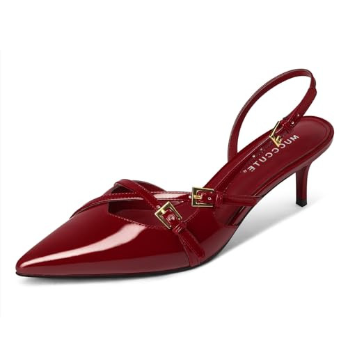 MUCCCUTE Burgundy Kitten Heels for Women Pointed Toe Slingback Pumps Low Heels with Buckle Strap Heeled Sandals Size 7.5