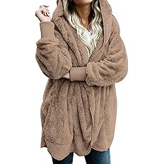 Women Hooded Cardigan Fuzzy Jacket Winter Open Front Fleece Coat Outwear with Pockets Brown M at ...