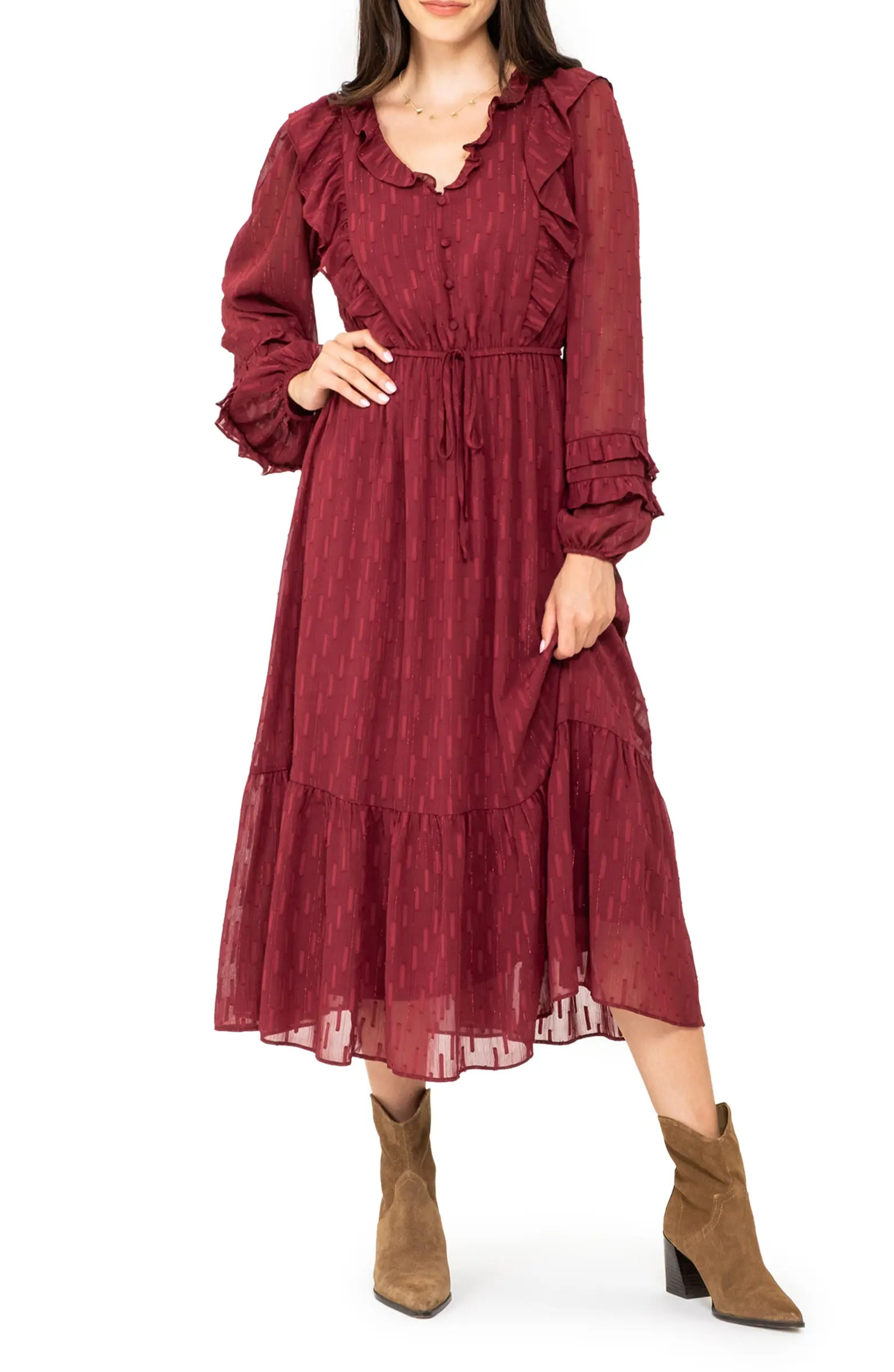 Long Sleeve Clip Dot Chiffon Midi Dress
