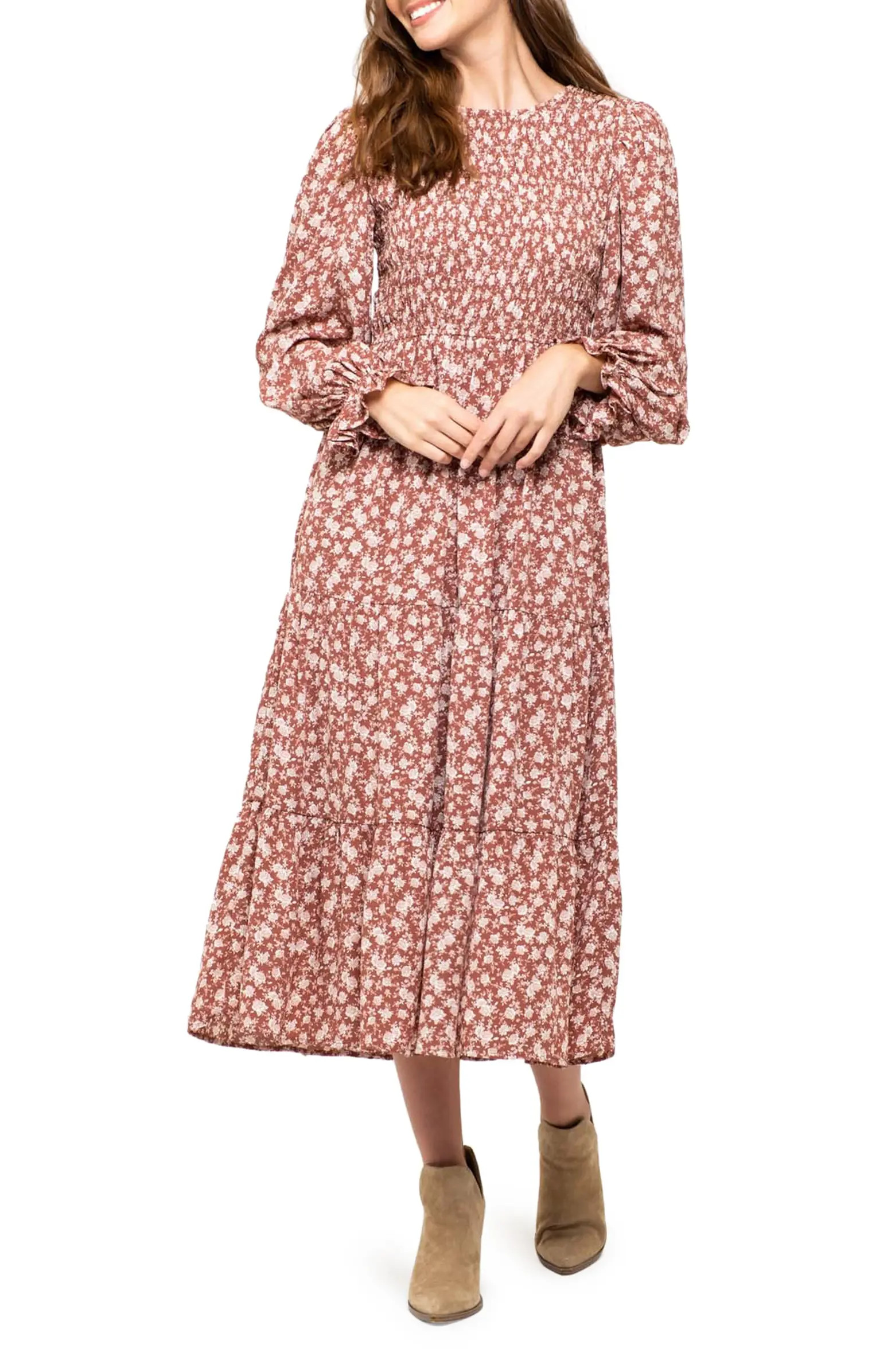 August Sky Women's Floral Long Sleeve Smocked Midi Dress