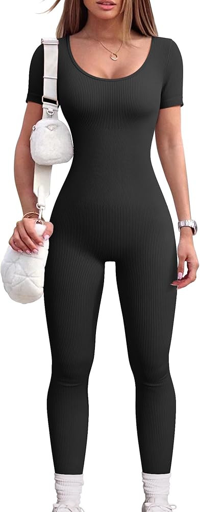 OQQ Women‘s Yoga Jumpsuits Ribbed One Piece Workout Short Sleeve Tops Exercise Jumpsuits
