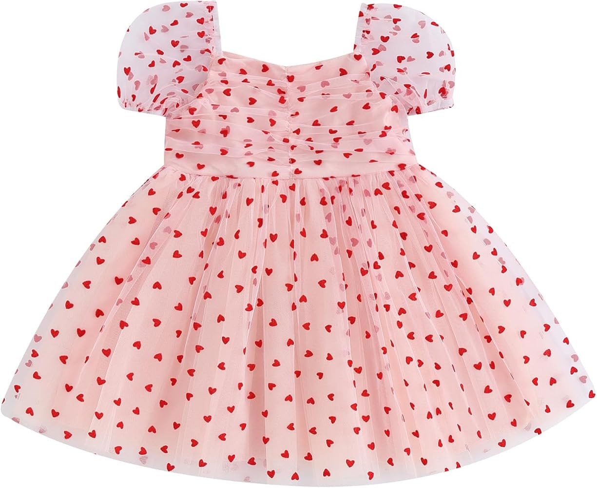 Toddler Baby Girl Valentines Day Outfits Puff Short Sleeve Heart Print Tutu Tulle Dress Spring Su...