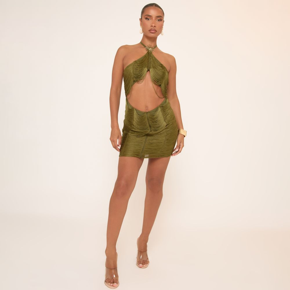 Halterneck Draped Tassel Detail Mini Dress In Green