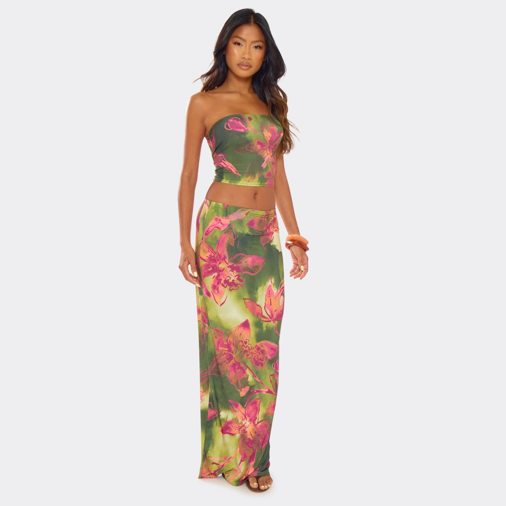 Bandeau Fitted Top In Green Flower Print Slinky
