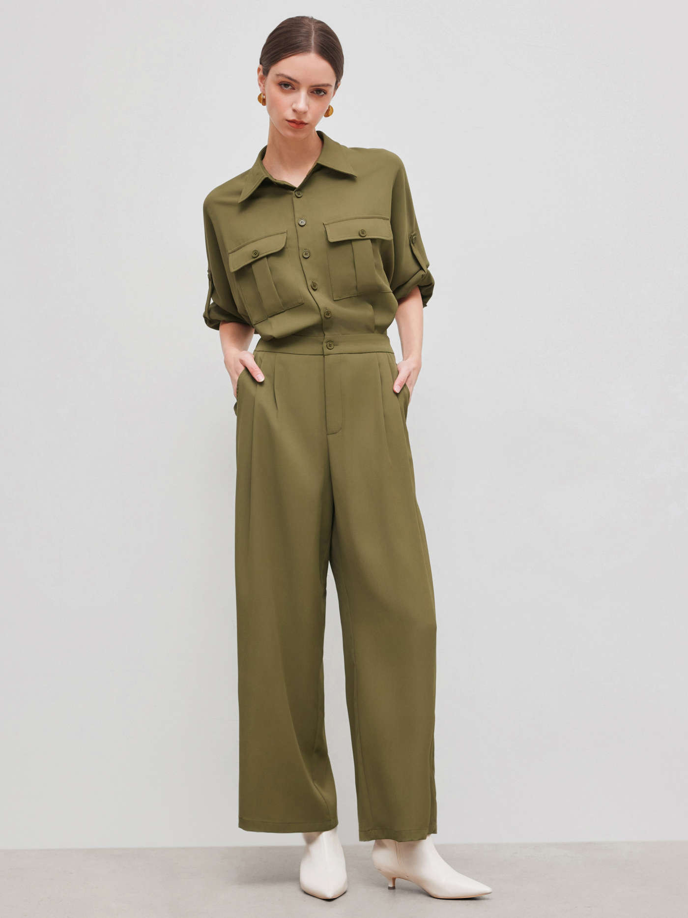 Woven Collar Solid Button Pocket Straight Leg Jumpsuit For Work